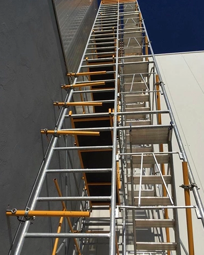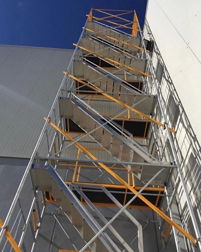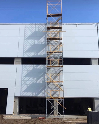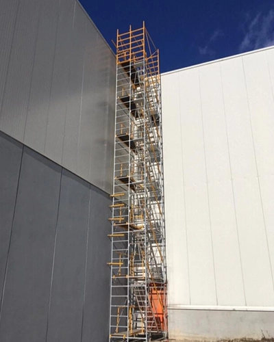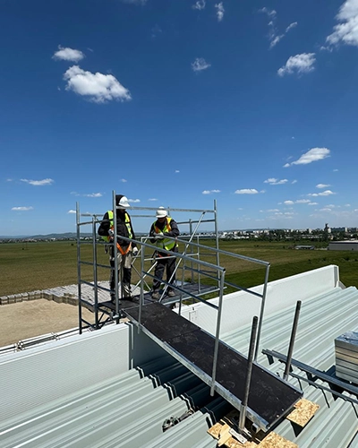 Fiind un proiect realizat pe o hală în construcție, unde planșeele intermediare nu erau încă finalizate, am integrat în turnul de schelă platforme intermediare metalice, prevăzute cu balustrade și protecții laterale. Acestea au permis lucrătorilor să urce în siguranță la diferite niveluri, fără a depinde de structura clădirii.