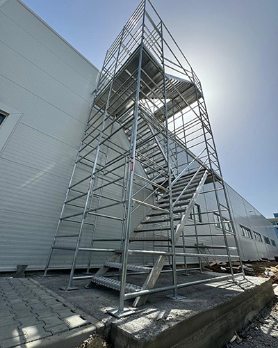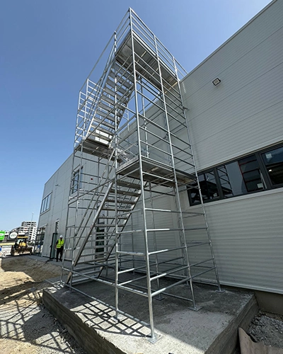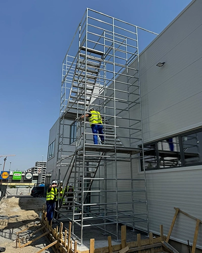 Acest proiect a fost realizat pentru șantierul unei clădiri Tesla, unde am furnizat și montat o schelă turn metalică, complet personalizată, cu acces integrat. Pe lângă structura principală, am proiectat și livrat două elemente esențiale: scările interioare modulare și scara superioară de vârf – componente independente care se pot comanda și separat.